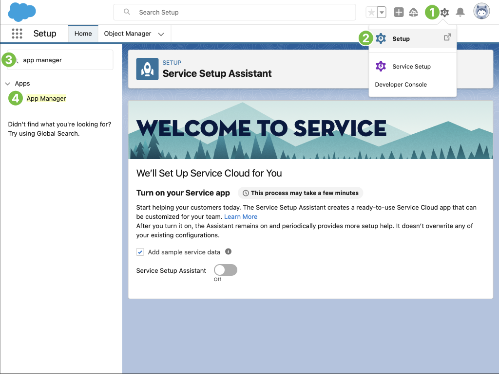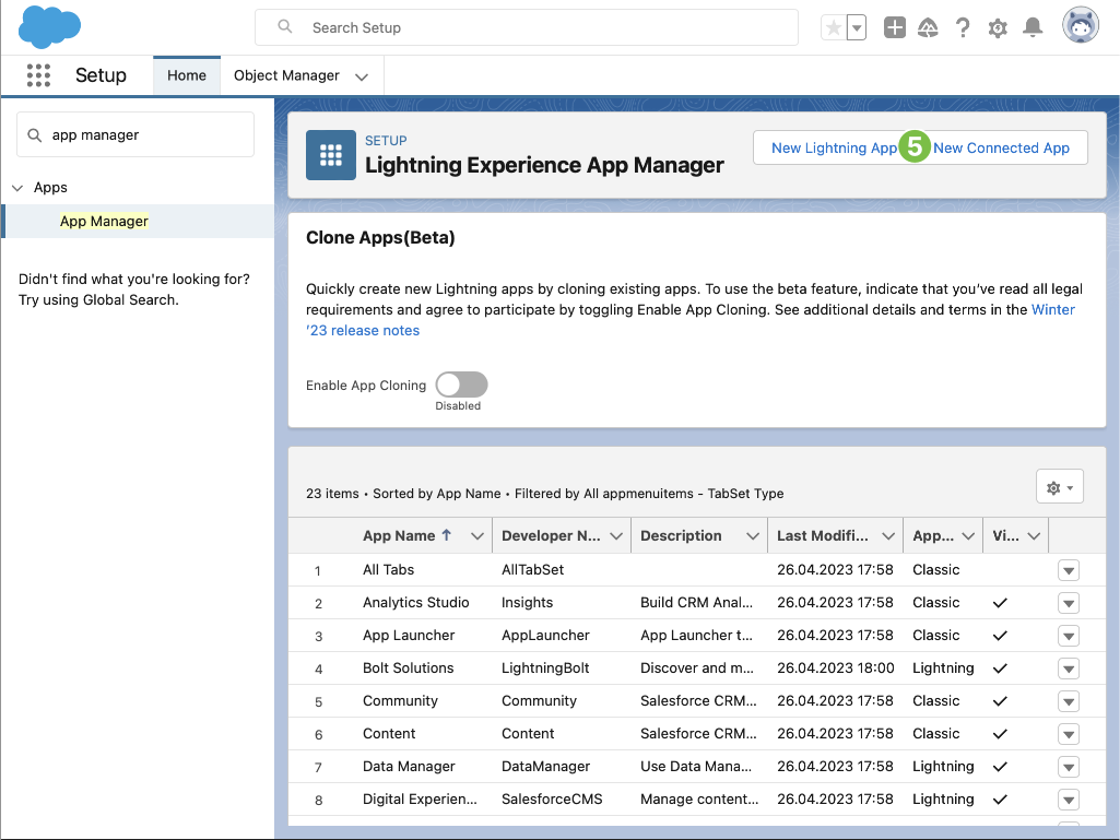 1. In the Setup application, press the Quick Find field in the top right corner and search for App Manager