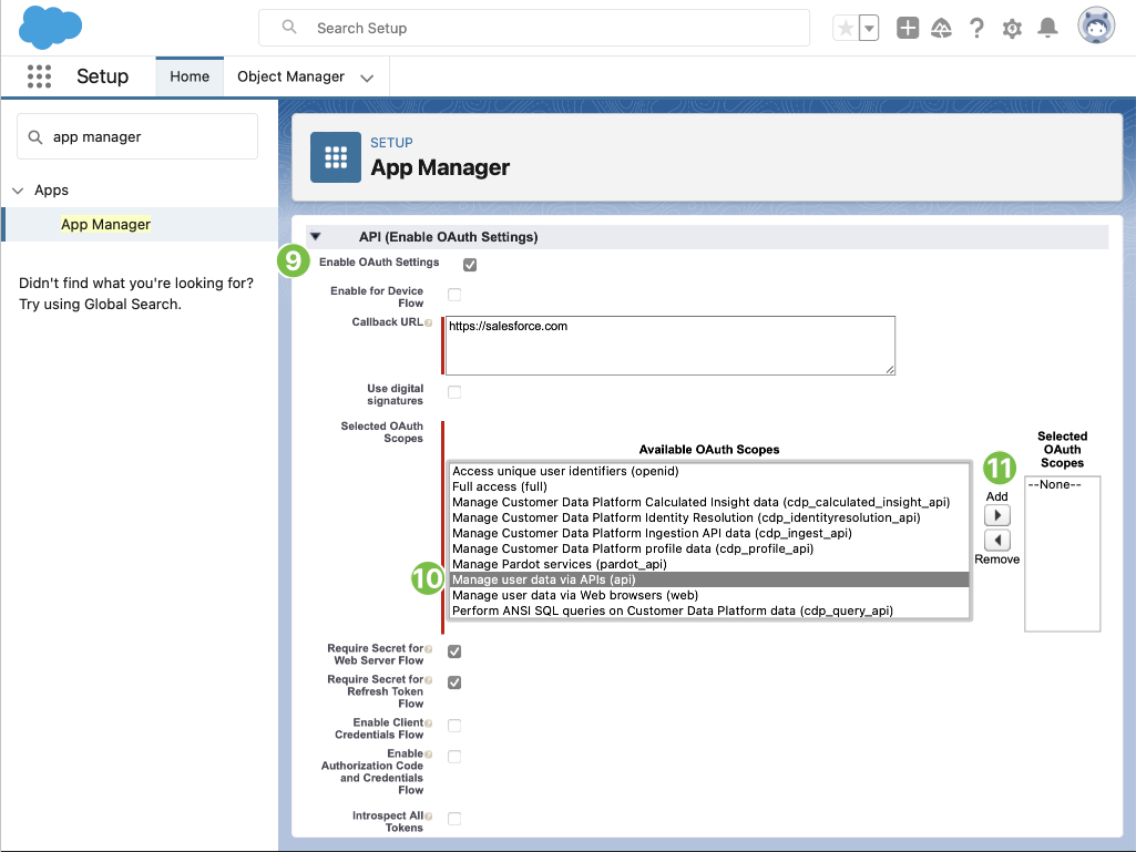 1. In Selected OAuth Scopes section in Available OAuth Scopes choose Manage user data via APIs and press Add right arrow to add the scope into Selected OAuth Scopes
