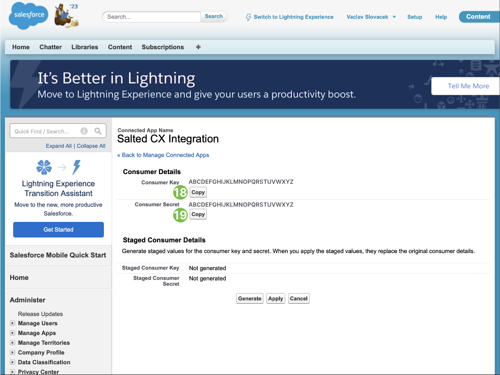 • Add Connected Application. This adds Salted CX as an application to Salesforce. Only connected applications can retrieve data from Salesforce.