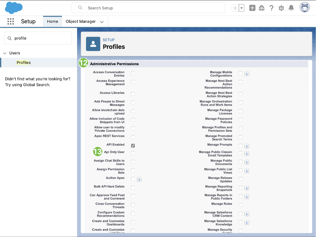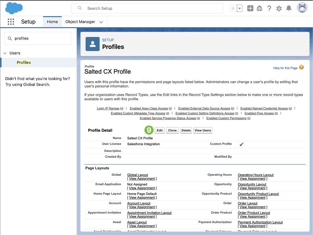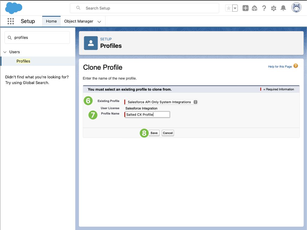 The following steps create a Salesforce profile that limits access of Salted CX integration to Salesforce features and data. These instructions focus on giving minimal necessary access to Salted CX: