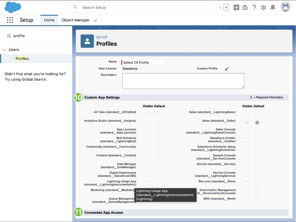 • Create Salesforce Profile. This profile in Salesforce will contain all permissions that Salted CX has when accessing Salesforce.