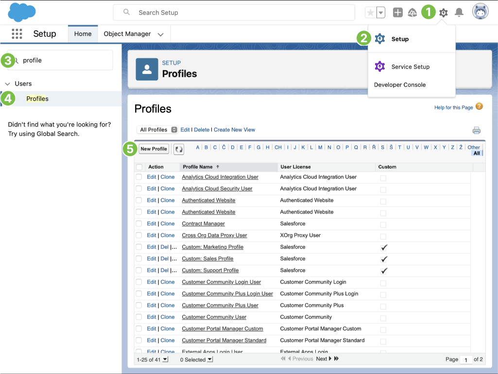 1. In the Setup application, press the Quick Find field in the top right corner and search for Profiles
