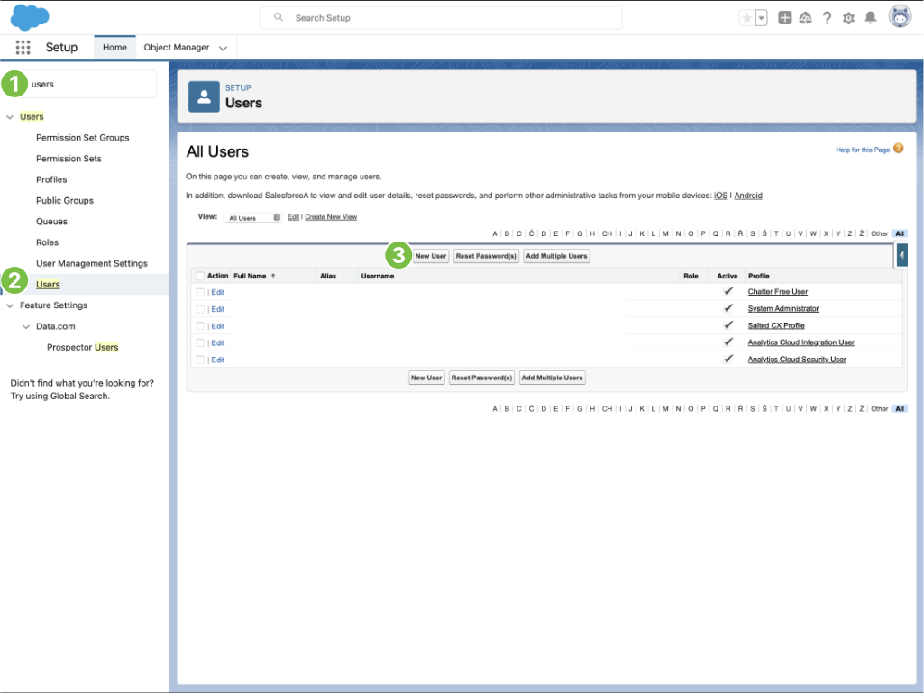 1. Search for Users in the left navigation in Setup