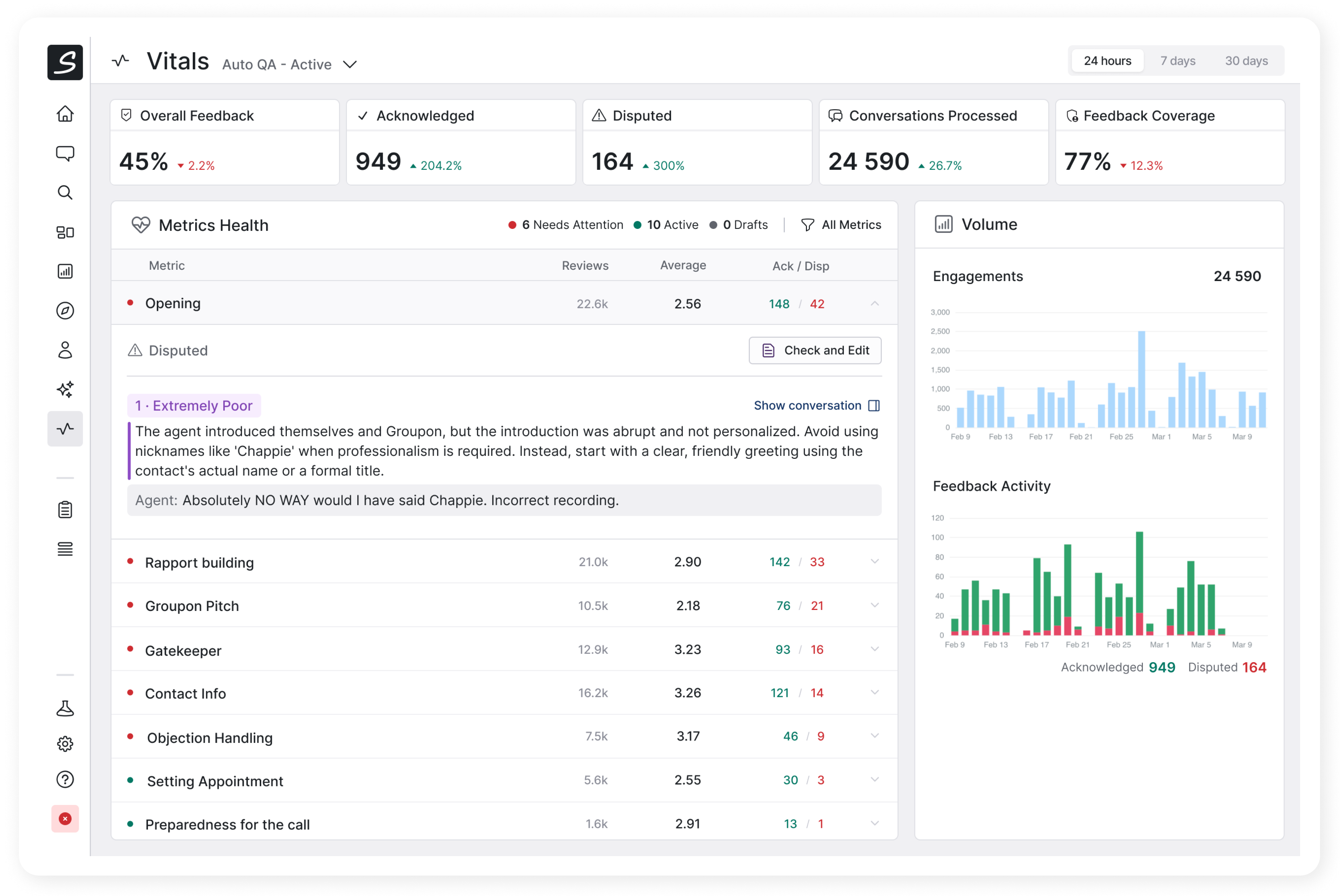 Vitals shifts verification from a small calibration team to the agents themselves. Every agent who receives feedback can acknowledge or dispute it: