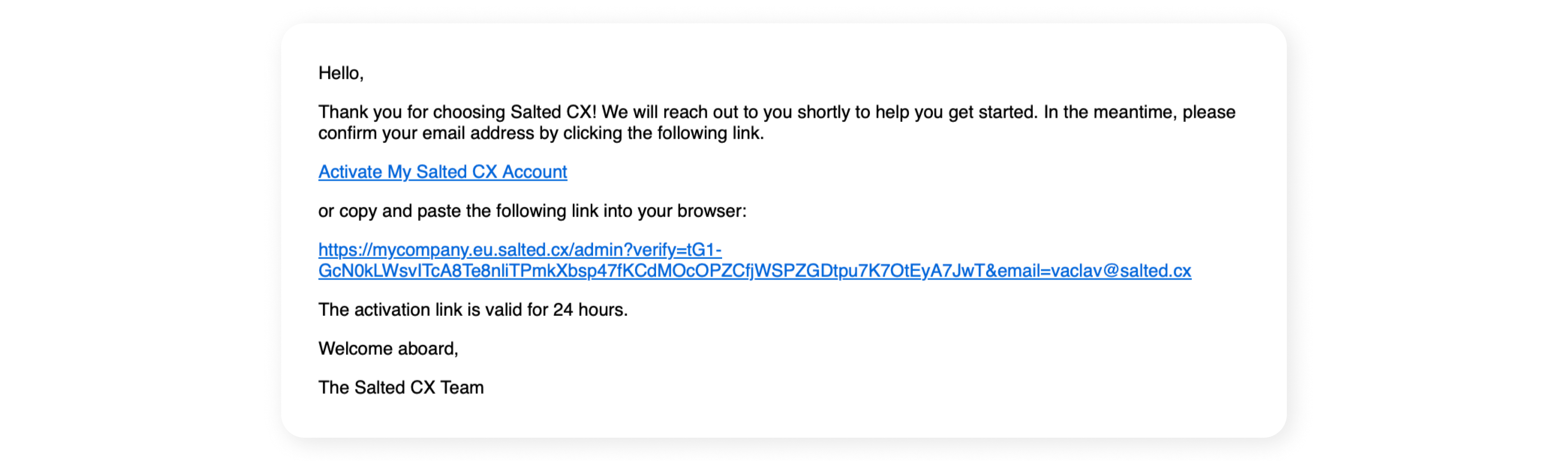 One account enables you to to access all features Salted CX offers on top of conversations from any number of data sources. Each account has a dedicated domain within a preferred region. For example mycompany.eu.salted.cx is an account of a company in the European Union. All domains in one region are on the same salted.cx sub-domain.
