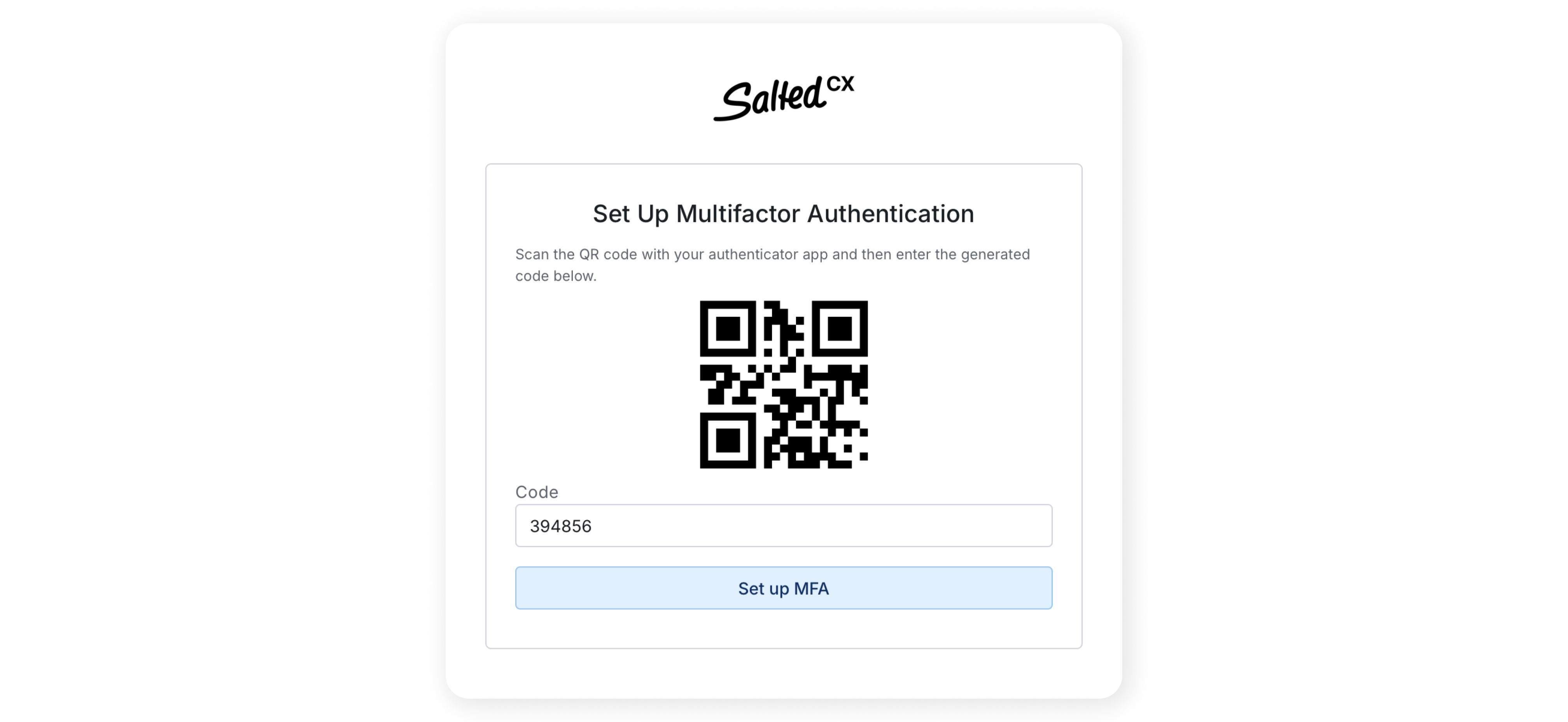 - Type the email you use for work into Work Email, this should not be email from personal email providers such as Gmail, iCloud, etc. You have to provide a valid email you have access to, so you can activate your account.We recommend using a group email with multiple associated members, such as [email protected]. This prevents loss of account management access if one person becomes unavailable. A group email simplifies adding and removing people authorized to manage the Salted CX account. Note that each user in the group will need to set up their own multi-factor authentication, as outlined in the later steps.
