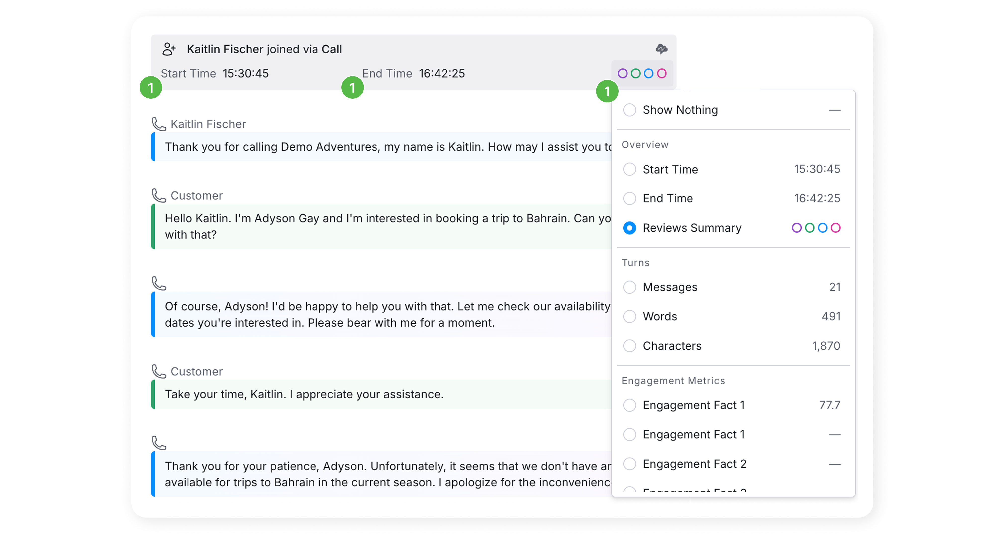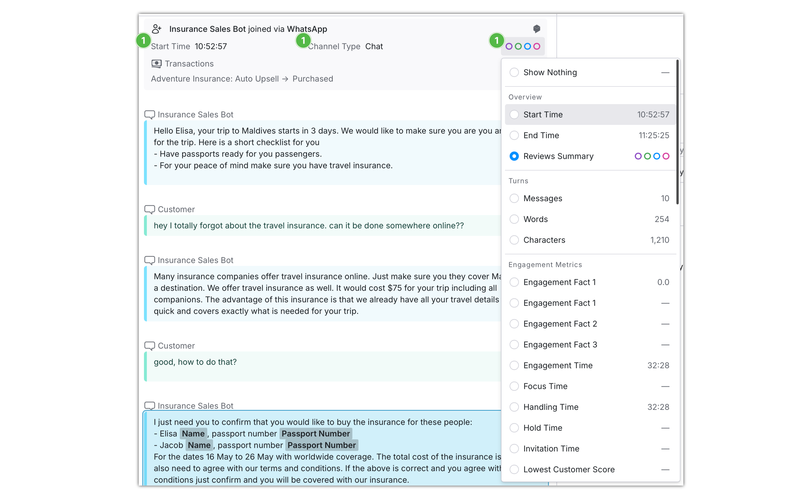 Engagements in customer journey represent individual agents including bots that engage with the customer to handle their requests. Each conversation in the customer journey can have multiple engagements with different agents when there are transfers or one agent takes over work after another agent.