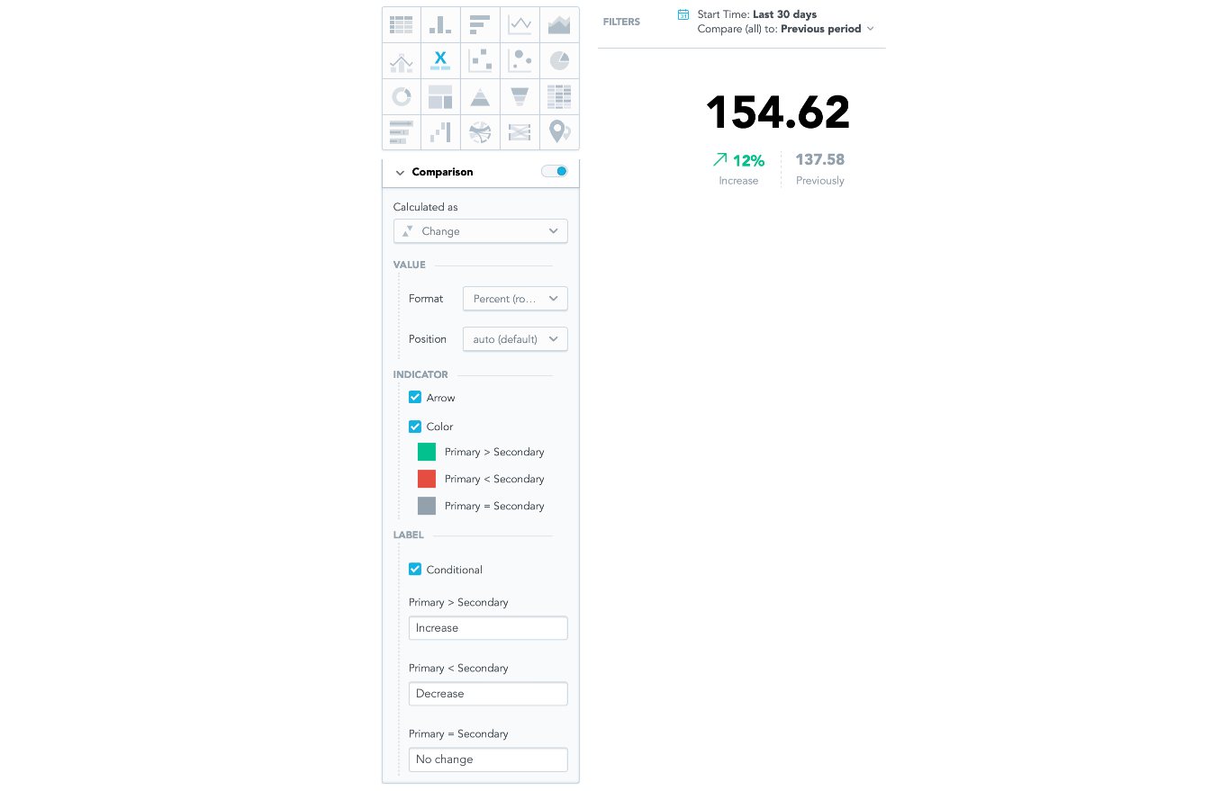 The headline insight has now more options to customize the comparison between the primary and secondary value. You can customize how the difference value is calculated, whether to show an arrow pointing up or down depending on the trend. You can also choose color and label depending on whether the primary value, is greater, lower, or the same as the secondary value. This enables you to communicate whether the change is trending in a positive or negative direction.