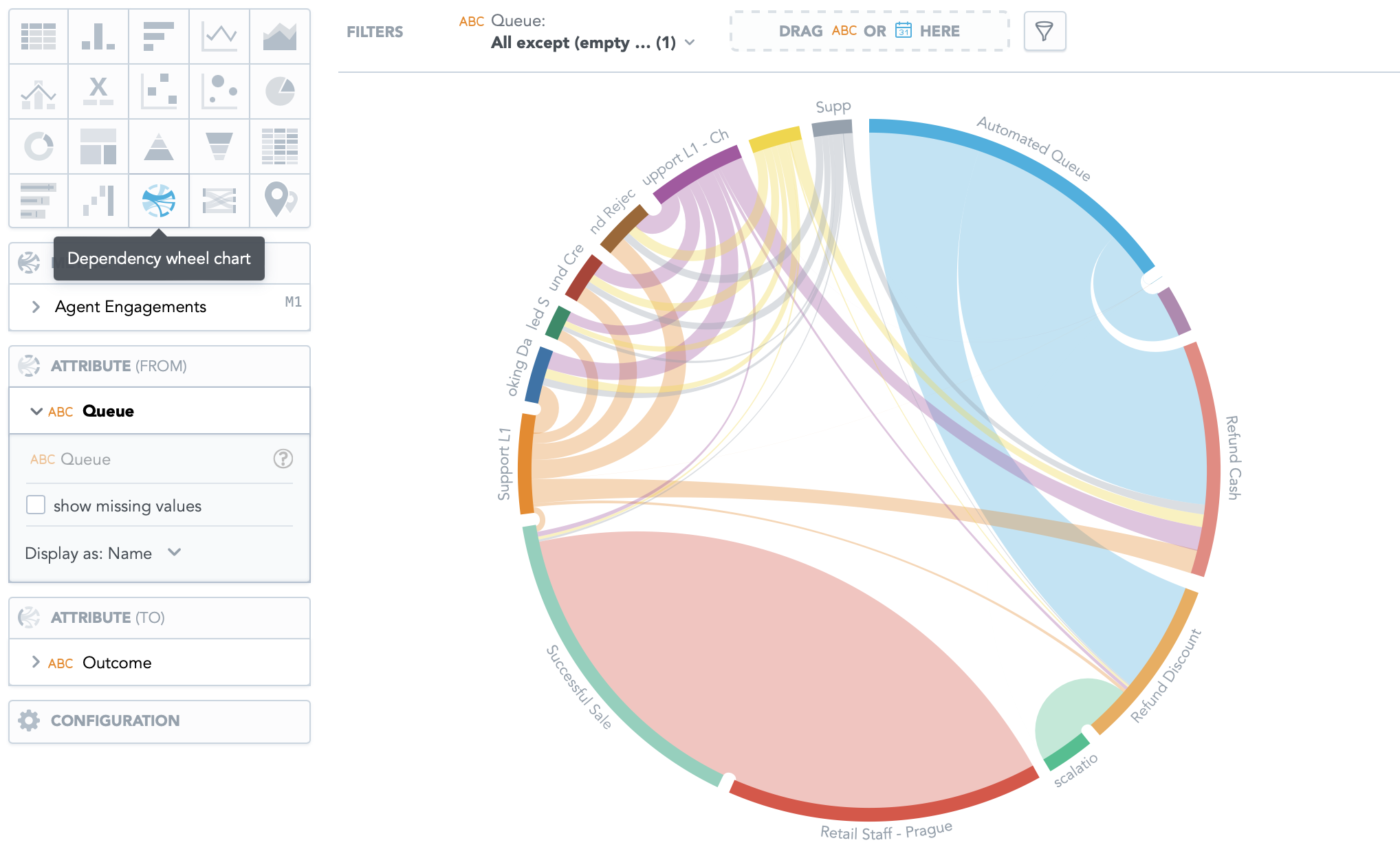 Drill-downs also lead to dashboards showing individual queues, channels, and outcomes to give you detailed information about them. Essentially any item that is bold in dashboards takes you further and enables you to explore those in depth.